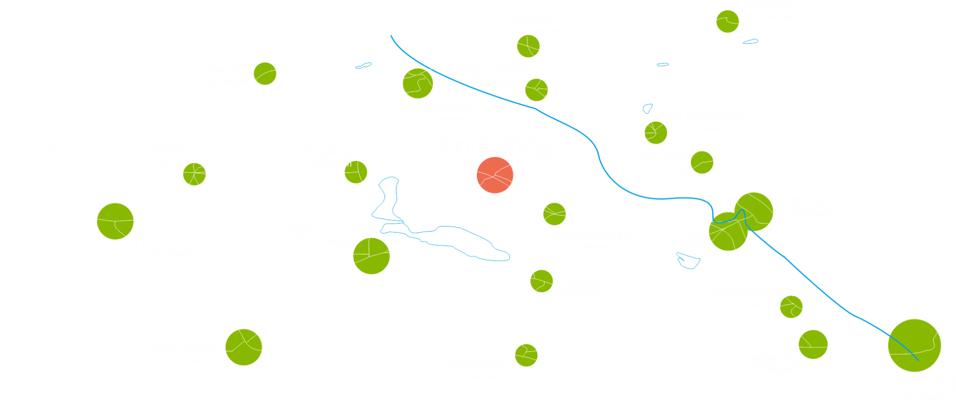 Die Angabe "in Minuten" ist in etwa die Fahrzeit mit dem Auto zu uns nach Fridolfing.